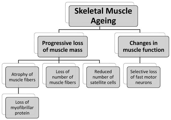 Muscle ageing is associated with a gradual decline in skeletal muscle mass and function. Myofibers, which are multinucleated syncytial cells with contractile proteins in their cytoplasm, make up the skeletal muscle. Myofibers are classed as slow twitch (type I) or fast twitch (type II) depending on whether they use aerobic (type I) or anaerobic (type II) metabolism. Ageing causes significant functional muscle strength reduction. Muscle strength can be measured in a variety of ways, including the maximum weight moved in a resistance exercise, the maximum torque produced eccentrically, isometrically, or concentrically, the maximum power produced, or the rate of force development (RFD), all of which have a negative relationship with age [,]. In particular, the muscle’s ability to create ‘rapid strength’ (power or RFD) is considerably impaired [], whereas ‘slow strength’ is less severely weakened. Muscle endurance, or fatigue resistance, on the other hand, is not decreased to the same extent as muscle strength []. Overall, these functional alterations in the muscle can be explained by a few biochemical changes, as shown in Figure 2.