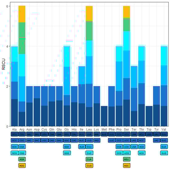Relative synonymous codon usage (RSCU) in A. shenzhenica mitogenome. Codon families are shown on the x-axis. RSCU values are the number of times a particular codon is observed relative to the number of times that codon would be expected for a uniform synonymous codon usage.