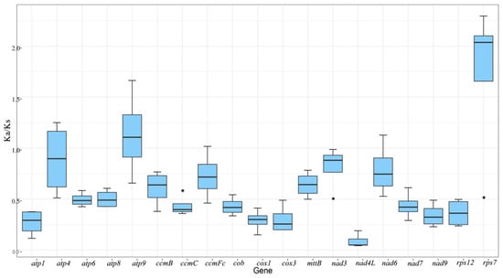 To investigate the evolutionary rate of mitochondrial genes, we calculated the non-synonymous substitution rate (Ka) and synonymous substitution rate (Ks) for the 19 shared PCGs of A. shenzhenica against the Allium cepa, Gastrodia elata, Hemerocallis citrina, and Asparagus officinalis mitogenomes. As shown in Figure 3, the Ka/Ks ratios were much lower than 1 in the majority of protein-coding genes, indicating the stability of the protein function of these genes during evolution. In contrast, the Ka/Ks ratios of atp9 (1.13) and rps7 (1.72) were greater than 1, implying that these genes were subjected to positive selection. In particular, the Ka/Ks ratios of rps7 in A. shenzhenica and G. elata were significantly higher than 2(2.3), whereas those of H. citrina and A. officinalis were also 2.04 (Table S2), indicating that they may be very crucial for the evolution of A. shenzhenica. According to previous reports, small mitochondrial subunit proteins encoded by the rps7 gene are essential for various biological activities in eukaryotes, such as embryonic development, leaf formation, and reproductive tissue formation [,,].