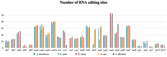 RNA editing, a post-transcriptional mechanism that occurs in higher plant chloroplasts and mitogenomes, aids in protein folding [,]. Each organelle is highly lineage-specific in terms of the frequency and the type of RNA editing [,,]. In the earlier studies, Oryza sativa exhibited 491 RNA editing sites in 34 genes [], and Phaseolus vulgaris showed 486 RNA editing sites in 31 genes []. In the present study, we predicted RNA editing sites in 28 PCGs common to G. elata, H. citrina, A. cepa, and A. officinalis mitogenomes. As shown in Figure 4, the number of RNA editing sites predicted in mitogenomes of different Asparagales species is very conserved, from 416 sites in A. shenzhenica to 552 sites in Asparagus officinalis. Of these, 514 are found in G. elata, of which 347 are shared with A. shenzhenica. These results suggest that they share highly conserved PCGs.