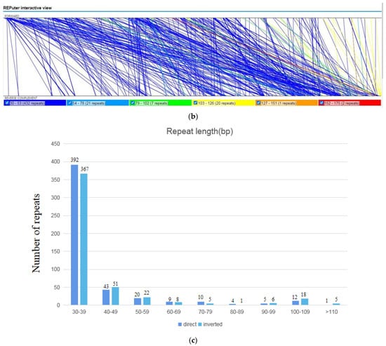 The MISAv2.1 (https://webblast.ipk-gatersleben.de/misa/, accessed on 1 September 2022) was used to assess the simple sequence repeats (SSRs) of the A. shenzhenica mitogenome [], with the motif size of one to six nucleotides and thresholds of 10, 5, 4, 3, 3 and 3, respectively. Tandem Repeats Finder v4.09 program [] (http://tandem.bu.edu/trf/trf.submit.options.html, accessed on 1 September 2022) with default parameters was used to find tandem repeats with >6 bp repeat unit. Using the REPuter web server [] (https://bibiserv.cebitec.uni-bielefeld.de/reputer, accessed on 5 September 2022) with the parameters “Hamming Distance 3, Maximum Computed Repeats 5000, Minimum Repeat Size 30,” dispersed repeats including forward, reverse, palindromic, and complementary repeats were discovered.