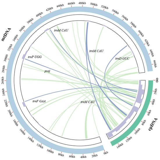 The A. shenzhenica cp genome (MG772639.1) was obtained from the NCBI Organelle Genome Resources database. BLASTN was used to analyze sequence similarity between the cpgenome and the mitogenome in order to detect transferred DNA fragments, and the e-value cut-off was 1 × 10−5 []. The Circos module implemented in TBtools v1.105 was used to visualize the results [,,].