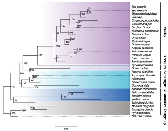 To understand the evolution of A. shenzhenica and the monocot mitogenome, we performed phylogenetic analyses on A. shenzhenica and 28 other monocots and four dicots (designated as the outgroup). Table S6 lists the accession numbers for the mitogenomes analysed in this study. A phylogenetic tree was constructed using an aligned data matrix comprising 28 conserved protein-coding genes from these species, as illustrated in Figure 7. The phylogenetic tree strongly supported the separation of monocots and dicotyledonous plants. Moreover, taxa from four orders (Alismatales, Asparagus, Arecales, and Poales) were well clustered. The clustering relationships of taxa in the phylogenetic tree in this study were consistent with those of previous studies examining the evolutionary relationships of these species.