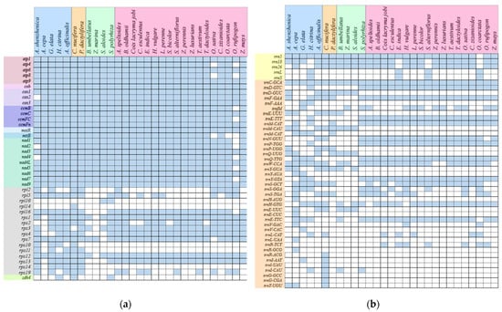 Comparison of genes contents between of A. shenzhenica and other 28 monocots species mitogenome. (a). The genes of CDS. (b). The genes of RNA. Blue-colored boxes represent active genes and blank boxes represent gene loss.