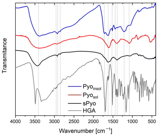 Fourier transform infrared (FTIR) spectra of the water-soluble pyomelanin (Pyosol), water-insoluble pyomelanin (Pyoinsol), synthetic pyomelanin (sPyo) and homogentisic acid (HGA).