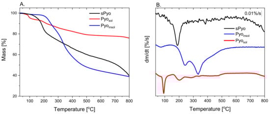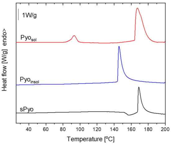 To determine the thermal stability of the pigments, thermogravimetric measurements in an inert atmosphere were performed. Thermal stability is a key parameter determining the possibility of processing pyomelanin by thermal processing methods used for the fabrication of composites and blends with other thermoplastic biopolymers. The TGA curves and the first derivative of the mass with respect to time (dm/dt = f(T)) curves of the dyes are presented in Figure 2, and the estimated characteristic parameters of thermal degradation are collected in Table 2. Based on the shape of the TGA and first derivative curves, it can be concluded that the dyes differed in degradation mechanism. The common feature of the dyes was the presence of the first stage of mass loss occurring up to 125 °C. The maximum rate of the first stage of mass loss, set as the maximum of the first peak on dm/dt = f(T) curves, was located at a similar temperature denoted as the T1st peak. This stage of mass loss could be assigned to the loss of volatile low molar mass species. The highest mass loss up to 125 °C was exhibited by Pyosol. Only at a temperature range of mass loss up to 125 °C did the endothermic effect occur for Pyosol, as indicated by the endothermic peak on the DSC curve of Pyosol (Figure 3). The temperature range of the endothermic effect, the corresponding highest mass loss in the case of Pyosol and the fact that Pyosol was isolated from the water phase, allows the assuming of the first stage of mass loss to water loss (Figure 2). The second stage of mass loss could be assigned to the beginning of pyrolysis of pyomelanin. The temperature of onset of the second mass loss can be taken as an upper limit of the thermal stability of pyomelanin (Tdegonset). The highest Tdegonset was observed for Pyoinsol (196.4 °C); for other pyomelanins, Tdegonset was lower and was located at 173.0 °C and 158.0 °C for Pyosol and sPyo, respectively. Moreover, for sPyo, above 125 °C, continuous mass loss occurred up to the onset of the main degradation. Thus, Pyoinsol and Pyosol showed superior thermal stability to that of sPyo. Pyosol had a significantly greater residue at 800 °C (75%) than Pyoinsol and sPyo (ca. 40%), indicating a greater proportion of aromatic moieties or other conjugated unsaturated bonds in polymer chains.