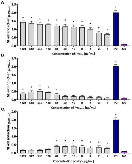 Pyosol activated NF-κB in the concentration range of 1–1024 μg/mL (the absorbance ranged from 0.70 to 1.43, p < 0.05) (Figure 5A). In cell cultures treated with Pyoinsol, a significant induction of NF-κB was observed in the concentration range of 64–1024 μg/mL (p < 0.05) (Figure 5B). However, the level of activation was lower than that in cell cultures exposed to Pyosol (absorbance range: 0.30–0.53). Moreover, sPyo induced NF-κB in the concentration range of 1–64 μg/mL; however, there were no differences between induction levels in response to different pyomelanin concentrations within this range (the absorbance range 0.29–0.41) (Figure 5C). The level of NF-κB activation in response to E. coli LPS shown as absorbance was equal to 2.07 (p < 0.05) (Figure 5A–C).