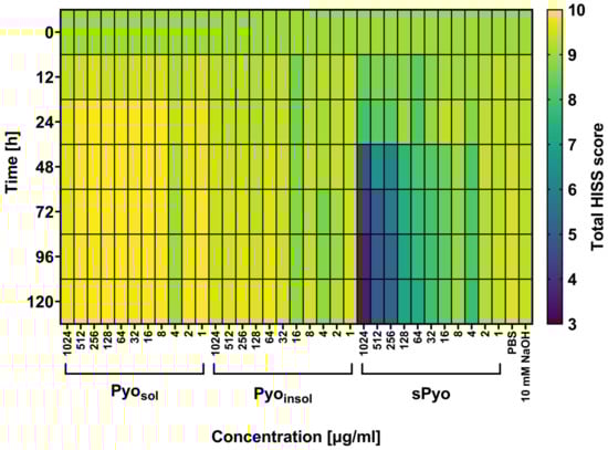 Total Health Index Scoring System (HISS) heatmap for G. mellonella larvae treated with tested pyomelanin variants. Larvae were injected with water-soluble (Pyosol), water-insoluble (Pyoinsol) or synthetic pyomelanin (sPyo) in the concentration range of 1–1024 μg/mL or control solvent solutions: phosphate-buffered saline (PBS) or 50 mM NaOH. At 0, 12, 24, 48, 72, 96, and 120 h after the injection of pyomelanin, the health of the larvae was evaluated using HISS and expressed as the total HISS score. Statistical significance was calculated using ANOVA analysis, followed by Dunnett’s post hoc test. Statistical significance between Pyo concentrations was calculated using ANOVA analysis, followed by Tukey’s post hoc test. sPyo toxicity to G. mellonella was dose-dependent in concentration range 1024–64 µg/mL (p < 0.05).
