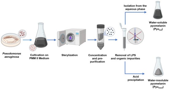 Lipopolysaccharides (LPSs) were removed from P. aeruginosa pyomelanin by affinity chromatography using Pierce™ High Capacity Endotoxin Removal Spin Columns (Thermo Scientific, Waltham, MA, USA). The resin and column were prepared and equilibrated according to the manufacturer’s protocol. Samples of Pyosol and Pyoinsol (5 mg/mL) were applied to the columns, incubated for 3 h with gentle mixing, centrifuged at 500× g, collected into new tubes and dried at 50 °C overnight. The pyomelanin pellet was washed with chloroform, ethyl acetate, ethanol and water. For further experiments, the pyomelanin was stored in a dark and dry place at 4 °C. The methodology for the isolation and purification of bacterial pyomelanins is shown in Figure 7.