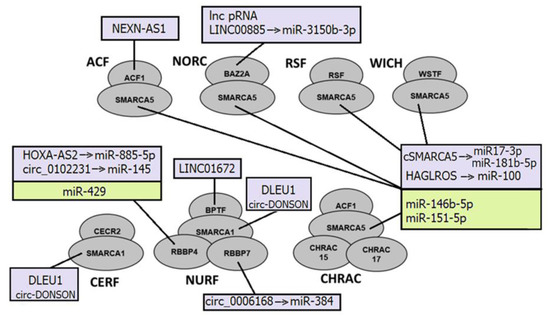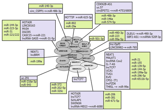 NcRNA regulation commonly appears at the post-transcriptional level. Thus, miRNAs can influence chromatin remodelers by targeting mRNAs of the genes coding their subunits [52]. Computation algorithms and databases predict hundreds of miRNAs that potentially target subunits from SWI/SNF, ISWI, CHD, and INO80 complexes, based on the complementarity of their sequences. Some of them have already been validated as the target pairs (Table 1), and often it was done through a correlation analysis of the expression profiles of specific remodeler subunits with miRNAs identified in different types of cancer [6,7].