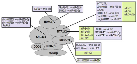 Relatively recent confirmation of the non-protein-coding transcriptome functionality and further understanding of its involvement in the regulation of important biological processes led to the recognition of non-coding RNAs (ncRNAs) as epigenetic regulators. NcRNAs are numerous, diverse in forms and functions, and can interact with different molecules, including RNA, DNA, and proteins, both directly and indirectly [5]. The interplay of different classes of epigenetic regulators suggests the mutual regulation of ncRNAs and chromatin remodeling machinery. A number of recent investigations revealed a broad association of ncRNAs with chromatin remodeling complexes, supporting this suggestion [6]. Both subunits of chromatin remodeling complexes and ncRNAs were found to be mutated and/or deregulated in human diseases and affecting the expression program of many genes associated with their development and progression [7]. Currently, advances in genomic and proteomic techniques allow us to obtain a significant amount of information about the aberrations of epigenetic mechanisms and apply them practically. Targeting the epigenetic regulators involved in pathogenesis is an attractive option, despite not being sufficiently studied yet. As groups of epigenetic regulators, chromatin remodeling complexes and ncRNAs evoke reversible alterations in gene expression. Furthermore, their deregulation appears at the early stages of diseases and significantly correlates with their progression. These characteristics make them prominent diagnostic and prognostic biomarkers, as well as potential targets for therapeutic agents [8].