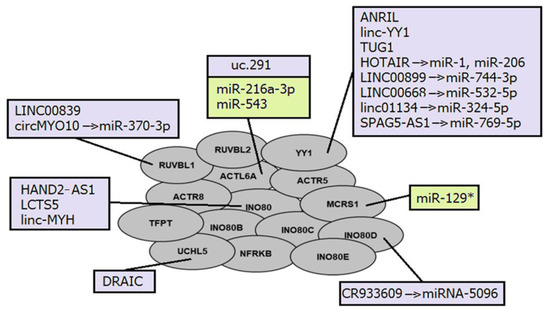 In contrast to miRNAs, lncRNAs can regulate chromatin remodeling complexes by variable mechanisms. LncRNAs can directly interact with subunits, acting as guides to anchor the chromatin remodeling complexes or as a decoy to keep chromatin modifiers away from specific sites in the genome. They also can be incorporated into complexes, serve as signals for decoding chromatin modifications, and act as molecular scaffolds to assemble the complex for chromatin remodeling [5,6,7]. LncRNAs can regulate protein complex stability by promoting or inhibiting protein degradation [66]. LncRNAs frequently act as molecular sponges of miRNAs when they have miRNA-binding sites, which are complementary with Ago binding sites in miRNAs. In this case, they can bind specific miRNAs and prevent their interaction with the targets, thus affecting their expression levels and forming lncRNA-miRNAs-mRNA regulatory axes [67,68]. A similar mechanism is common for circRNAs [60,69]. Currently, more than 50 lncRNAs have been described to affect chromatin remodeling complexes, both directly and via lncRNA-miRNAs-mRNA regulatory axes. However, it seems, they are much more numerous [16] (Table 1).