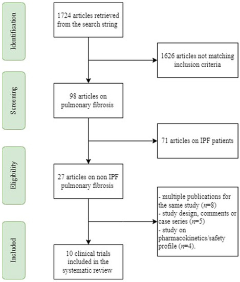 In total, 1724 publications were identified in the PubMed searches (Figure 1). Screening of titles and abstracts resulted in 1626 being excluded, leaving 98 publications. A manual search of the references of these selected articles found no additional publications that met the inclusion criteria and were not identified in the PubMed search. The majority of the studies were rejected because they either included IPF patients (n = 71), had multiple publications for the same study (n = 8), had study designs, comments, or case series (n = 5), or were pharmacokinetic or safety profile studies (n = 4).
