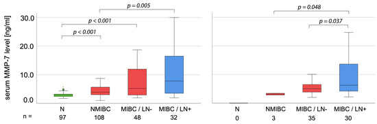 In this study, we assessed the prognostic value of MMP-7 in two additional UBC cohorts. Cohort 1 included 188 patients with available preoperative (TURB or RC) serum samples and 97 non-tumorous controls. We found the lowest MMP-7 levels (2.9 ng/mL) in controls, followed by non-muscle-invasive UBC patients (3.9 ng/mL) and muscle-invasive UBC patients (5.3 ng/mL), with the highest levels in LN-positive patients (7.8 ng/mL). Accordingly, the OS of patients with high (>7.15 ng/mL) MMP-7 levels was significantly shorter in both the whole cohort and the subgroup of muscle-invasive UBC patients. These correlations remained significant in the multivariate analysis as well.