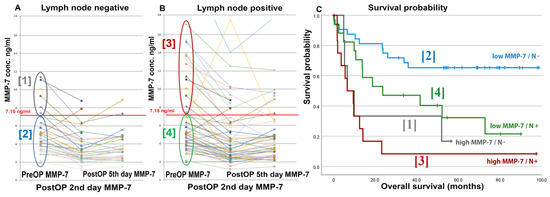 Pre- and postoperative (days 2 and 5) serum MMP-7 levels in LN negative (A) and positive patients (B) and corresponding Kaplan–Meier survival curves (C). Note that patients with high preoperative serum MMP-7 levels and LN-negative histological findings have comparatively poorer survival than those with LN-positive tumors.