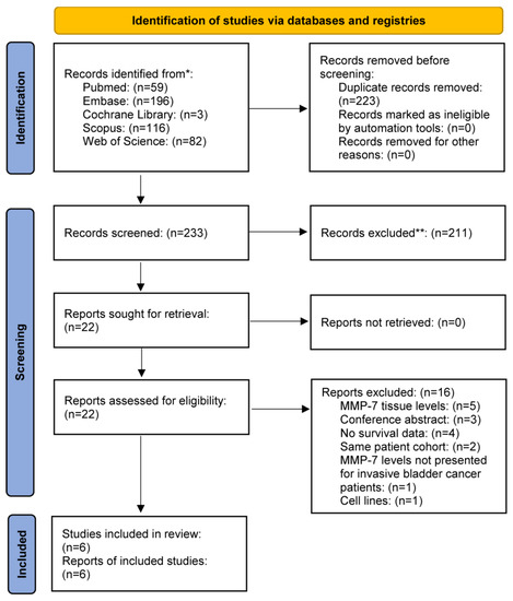 The PECO framework was applied to formulate our research question. We included original studies that investigated (P) urothelial cancer patients treated with surgery or systemic therapy and (E and C) compared the hazards of pretreatment high and low serum or plasma MMP-7 levels in terms of (O) overall survival. To define high and low levels of MMP-7, we used the included cut-off values for pretreatment serum and plasma biomarker levels at the protein level (e.g., via immunoassay) reported in each eligible article. We excluded studies with tissue biomarker levels, postoperative MMP-7 levels only, reviews, meta-analyses, conference abstracts, case reports, and case series. No restrictions were made based on cohort size or study design.