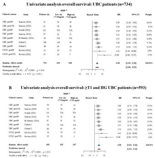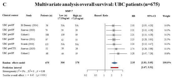 Forest plots representing hazard ratios of (A) all urothelial cancer patients (n = 734) OS, (B) hazard ratios of ≥T1 and HG urothelial cancer patients (n = 593) OS using the univariate Cox regression survival analysis, and (C) hazard ratios of urothelial carcinoma patients (n = 675) OS using multivariate Cox regression survival analysis in urothelial cancer patients with high pretreatment MMP-7 levels (cut-off value: 7.15 ng/mL) [16,21,30,31,32,33].