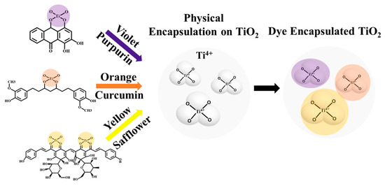 The chemical encapsulation was conducted through the co-precipitation of TiO2 particles and natural organic dyes in an ammonia solution (c.a. 25~30 vol%) which results in the self-assembly of constituents with different colors (Figure 1). In brief, colored mixtures of TiO2 and dyes were initially centrifuged to remove lightweight and unreacted constituents, which was especially effective for residual dye removal. It should be noted that natural organic dyes are well dispersed in ammonia solutions [36]. Indeed, centrifugal separation was helpful for the separation of small TiO2 particles with certain density gradients [37]. After rinsing with DI water, the mixtures were collected on filter paper and dried at 80 °C without a vacuum. We hypothesized that the mixtures are chemically integrated with surface functional groups which boosts hybridization with physical depletion forces.