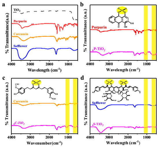 To verify the potential interaction between TiO2 and natural organic dyes, the characteristic surface functional group was investigated with Fourier transform infrared spectroscopy (FTIR). Figure 2 shows the FTIR spectra of control TiO2, natural organic dyes, and their composites. For TiO2, two characteristic bands from O-H stretching and bending were observed near 3500 cm−1 and 1630 cm−1, respectively [38,39]. Note that these two peaks slightly shifted to higher frequencies after hybridization. Importantly, the natural organic dyes utilized here, including (1) anthraquinone purpurin, (2) turmeric curcumin, and (3) flavonoid safflower, each possess a conjugated system (i.e., a structure with a benzene ring). Therefore, strong stretching vibrations of the O-H bond (c.a. 3600–4000 cm−1), C-H bond (c.a. 400–1500 cm−1), and C=O (c.a. 1710–1720 cm−1) were observed for all dyes. Indeed, several minor peaks around 1350 cm−1 and 1000 cm−1 were found which could be attributed to the vibration of tertiary C-OH and the stretching of the =C-H group in the structure. Interestingly, there was a fluctuating broad band around 800 cm−1, potentially from Ti-O-C or Ti-O-Ti linkage, which could be altered by encapsulated dyes. However, the peak observed at 690 cm−1, corresponding to Ti-O bending, was significantly shifted to 614 cm−1, which indicates that the Ti-O bond was weakened by the encapsulation of dyes on the surface. Note that the peak shift was commonly observed at a high concentration (i.e., 1 wt%) of all dyes on the TiO2 surface. For safflower, the shift was less evident due to the complex conjugation of its aromatic structure (Figure 2d). The experimental results of FTIR spectra indicate that dyes could be progressively encapsulated on TiO2 with Ti-O-C linkage. The carbonyl functional group in various dyes plays a pivotal role in chemical interactions.