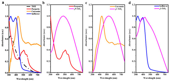 UV–Vis spectra of (a) control TiO2, (b) purpurin encapsulated TiO2, (c) curcumin encapsulated TiO2, and (d) safflower encapsulated TiO2 with a low concentration of 1.0 wt%.