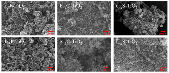 HR-SEM images of TiO2 natural organic dye nanocomposites. (a) Purpurin encapsulated TiO2 (0.1 wt%), (b) curcumin encapsulated TiO2 (0.1 wt%), (c) safflower encapsulated TiO2 (0.1 wt%), (d) purpurin encapsulated TiO2 (1.0 wt%), (e) curcumin encapsulated TiO2 (1.0 wt%), and (f) safflower encapsulated TiO2 (1.0 wt%).