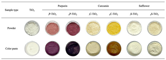In this study, we propose an effective strategy that exploits the encapsulation of natural organic dyes on TiO2 particles and creates warm tone colored materials with (1) violet, (2) orange, and (3) yellow, ultimately preserving the photochromism. We demonstrate that introducing three different natural organic dyes, including (1) purpurin (1,2,4-Trihydroxyanthraquinone) [34], (2) curcumin (Curcuma longa), and (3) safflower (Carthamus tinctorius) [35], effectively mitigates photochromism and increases the dispersing ability of TiO2 in the fabrication process of color paste. The introduction of natural organic dyes increases the diameter of TiO2 hybrid particulates with increasing concentrations aided by their outstanding adsorption and penetration. The successful encapsulation of natural organic dyes on the surface of TiO2 through a coordination bond provides opportunities to control the photochromism with a warm tone color. CIE-L*a*b* investigation confirms color changes from white to (1) violet, (2) orange, and (3) yellow with different natural organic dye sources. Together, the manipulated hybrid structure contributes to the design of appropriate colored photocatalysts for use in powders and pastes for cosmetics.