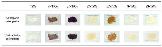 White titanium dioxide (TiO2), especially in the rutile phase, has been widely used as a photocatalytic ingredient due to its adequate band gap (i.e., 3.0 eV) [1,2,3], refractive index (i.e., 2.5) [4,5], and relatively low density (i.e., 3.78 g/cc). Indeed, their excellent control of particle sizes and facile dispersions in various solvents have powered their versatile use in real-life applications, such as pigments [6,7], paints [8,9], rubber [10], and cosmetics [11,12], for UV protection and permanent white color realization due to their outstanding chemical and physical stability. For color correction, TiO2 has certain advantages, including facile control of the particle size which efficiently scatters visible light and realizes a matte texture with a decrease in the particle size and clear opacity [13,14,15]. However, with their different particle sizes, TiO2 gradually changes from its original white color to yellow [16] or blue [17] (i.e., photochromism) which obscures the definition of permanent white. In principle, the oxidation state of Ti in TiO2 generally changes from Ti4+ to Ti3+ with a structural change in oxide on the surface of Ti under UV irradiation [18,19] which absorbs a shorter wavelength of light (i.e., blue shift) and displays a blue color.