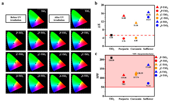 Evaluation of photochromism. (a) CIE L*a*b* 1931 chromaticity diagram, (b) color difference (∆E), and (c) the sun protection factor of TiO2 natural organic dye nanocomposites. CIE-L*a*b* was chosen to depict the approximate color for human vision. In CIE-L*a*b*, L* refers to perceptual lightness, a* refers to red and green colors of human vision, and b* refers to blue and yellow colors of human vision. Black dot in the center of chromaticity diagram using a black background provides a framework for specification of color sensation. In (b,c) square, triangle, and circle represents the control sample (bare TiO2), 0.1 wt% dye encap-sulated TiO2, and 1.0 wt% dye encapsulated TiO2, respectively. Red, green, and blue represents purpurin, curcumin, and safflower, respectively.