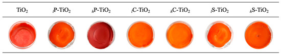 Table 2 shows the representative L*, a*, and b* values obtained from all of the different samples in paste form. Notably, we found that the value of L* decreased with encapsulation from 113.3 to 43.8, 77.5, and 110.1 with purpurin, curcumin, and safflower, respectively, suggesting a progressive reduction in perceptual lightness. This is attributed to the coverage effect of dyes on the TiO2 surface, which was observed in UV-Vis spectra. As observed in Figure 6, the original white color turned into darker violet, orange, and yellow with increasing concentrations which are reflected in L* values. Interestingly, for purpurin, a small amount of encapsulation reduced the L* value dramatically, which is mainly due to the strong color saturation. As observed in the digital photographs, with the encapsulation of purpurin, the color changed to a dark violet color consistently with increasing concentrations. Note that there was no linear relationship between the L* value and the degree of encapsulation predicted above. However, consistent with the original a* and b* values from curcumin [43], the color paste with hC-TiO2 showed positive values of 17.9 and 31.2 for a* and b*, respectively, which was the most dramatic shift in values compared with the other samples with purpurin and safflower. Similar to the UV-Vis spectra, the curcumin encapsulation was found to consistently be the most effective for color correction. In contrast, color pastes with S-TiO2 showed lower shifts in a* and b* values, which reflects their limit of encapsulation on TiO2. These changes in L*, a*, and b* with the encapsulation are commensurate for photochromism control, which is observed with UV irradiation.