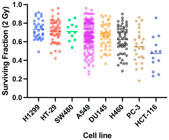 The clonogenic assay has been the gold standard method for measuring cellular radiosensitivity, providing a large amount of useful data. However, most of these studies were completed in different conditions and by different investigators, giving substantial variability in reported survival values, as elegantly demonstrated by Nuryadi et al. in the A549 cell model [5]. This same survival variability is observed in published data from other cell models, such as HT116, PC3, H460, DU145, SW480, HT29, and HT1299 (Figure 1) [6]. This enormous variability makes it very difficult to produce accurate radiosensitivity biomarkers or predictive models.