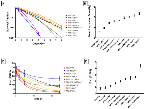 Radiosensitivity of CRISPR-modified cell lines with known defects in DNA repair pathways: (A) radiation-induced clonogenic survival curves, (B) mean inactivation values (MID) for each CRISPR cell model, (C) radiation-induced DSBs repair curves, and (D) baseline levels of DNA damage for each CRISPR cell model.