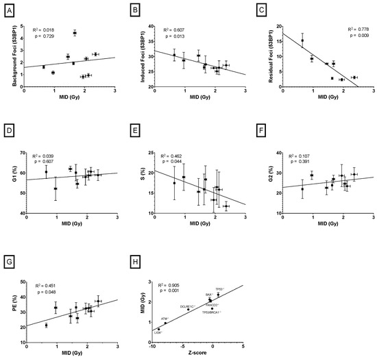 To identify if any cellular features provided an effective surrogate for radiosensitivity, we evaluated the correlation between MID and baseline DSBs (indirectly measured by the number of 53BP1 foci in control samples), radiation-induced DSBs (indirectly measured by the number of 53BP1 foci 30 min after irradiation), residual DSBs (indirectly measured by the number of 53BP1 foci 24 h after irradiation), cell cycle distribution and plating efficiency. The resulting correlation for each feature is plotted in Figure 3. Significant correlations were observed with induced DSBs (R2 = 0.61, p = 0.013), residual DSBs (R2 = 0.78, p = 0.009), and percentage of cell in S-phase of cell cycle (R2 = 0.46, p = 0.044). Plating efficiency is also statistically significantly correlated with MID (R2 = 0.45, p = 0.048), but this is dominated by the single outlying Lig4 KO cell line, and no significant trend is observed amongst other cell lines; however, and perhaps surprisingly, no significant correlation was seen between baseline DSBs and MID (R2 = 0.02, p = 0.729).