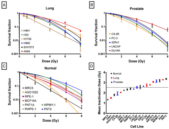 Radiation-induced survival curves: (A) lung cancer cell lines, (B) prostate cancer cell lines, (C) normal human cell lines, and (D) mean inactivation doses for each cell line. The dashed line represents the mean value across all cells. Experiments were carried out three times and error bars indicate the standard deviation of the means.