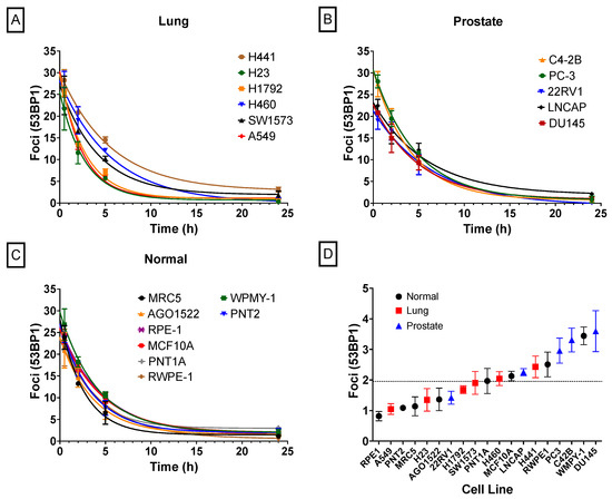 Repair kinetics of radiation-induced foci, measured by immunofluorescence of 53BP1 at 30 min, 2 h, 5 h, and 24 h after exposure to 2 Gy of radiation, divided into subgroups. (A) Lung cancer cell lines, (B) prostate cancer cell lines, (C) normal human cell lines, and (D) levels of background damage in control samples for each cell line. The dashed line represents the mean across all cells. Experiments were carried out three times and error bars indicate the standard deviation of the means.