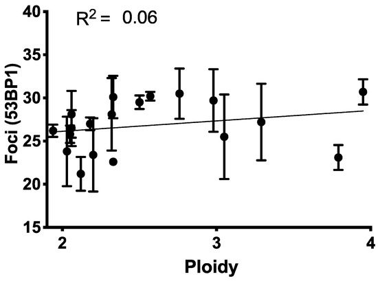 Initial yields of 53BP1 foci compared with cell ploidy. Although many models assume a linear relationship between these quantities, no statistically significant correlation is seen (p = 0.31).