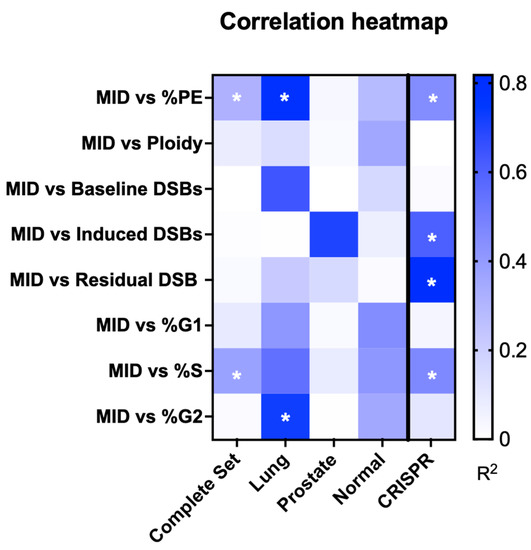 Heatmap of the potential predictive power of different cellular characteristics as a surrogate metric of radiation response, via correlation with MID. Residual damage after irradiation performed well as a sensitivity biomarker for CRISPR-modified cell lines, but failed to predict survival of cancer cells, likely due to their more complex genetic profile where alterations in other pathways, such as proliferation or metabolism, may have a larger impact on their radiation response. * Shows metrics which statistically significantly correlated with MID (p < 0.05).