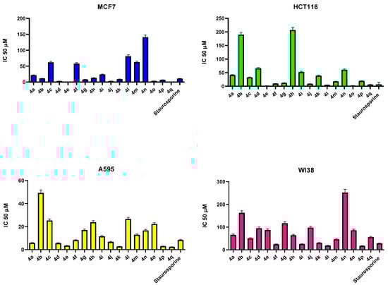 | Code | M.W (g/mol) | MCF7 | HCT116 | A549 | WI38 |