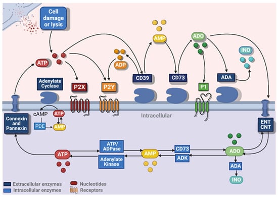These nucleotides and nucleosides are recognised by cells via the P2 and P1 purinergic receptors, which contain different subunits and have distinct affinities for these molecules, leading to different cellular effects [6]. The P2 receptors are divided into P2X1–P2X7, which respond exclusively to ATP, P2Y1–P2Y13 (which have affinity for both ATP and ADP), and pyrimidines (UTP and UDP). The P1 receptors—A1, A2A, A2B and A3—are responsive mainly to ADO, although they may also respond to INO [7]. On the other hand, concentrative nucleoside transporters (CNT1–CNT3) and equilibrative nucleotide transporters (ENT1–ENT4) help to regulate the transport of ADO between intracellular and extracellular spaces [8]. In the intracellular space, ADO can be converted into INO by cytoplasmic ADA or transformed into AMP by adenosine kinase (ADK), which results in the formation of ATP by adenylate kinase. This intracellular ATP can be released to extracellular space by transporter channels, catabolised to cyclic AMP (cAMP) by adenylate-cyclase and phosphodiesterase (PDE), or degraded to ADO by ATP/ADPase and CD73 [8] (Figure 1).