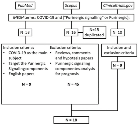 As shown in Figure 2, we searched the PubMed and Scopus databases in addition to clinicaltrials.gov with the keywords ‘COVID-19’ AND ‘purinergic’. We used ‘purinergic’ as a keyword to collect all published papers about the specific subject. Variations such as ‘purinergic signalling’, ‘purinergic system’, or ‘purinergic pathway’ are used by researchers throughout the literature. The inclusion criteria were: (1) COVID-19 is the main subject of study, and (2) analysis of the purinergic signalling components as a target for therapy instead of prognosis. The exclusion criteria were: (1) reviews, comments or hypotheses; (2) duplicate papers; and (3) no experiments to test the hypotheses.