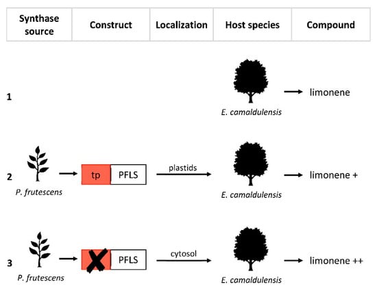 Re-localization approaches of limonene synthase from Perilla frutescens. PFLS, P. frutescens limonene synthase with plastid localization signal at the N-terminal (tp). (1) Production of limonene in wild-type Eucalyptus camaldulensis. (2) Transformation of E. camaldulensis with PFLS. (3) Transformation of E. camaldulensis with modified PFLS by removal of tp. The “+” symbols indicate an increase in limonene production compared to (1).