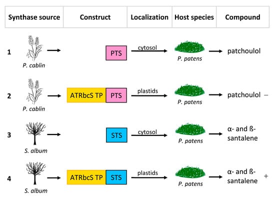 Re-localization approaches of patchoulol synthase from Pogostemon cablin (PTS) and α/β-santalene synthase from Santalum album (STS). ATRbcsS TP, transit peptide of the small RuBisCO subunit of Arabidopsis thaliana. (1) Transformation of Physcomitrella patens with PTS. (2) Transformation of P. patens with PTS + ATRbcsS TP. (3) Transformation of P. patens with STS. (4) Transformation of P. patens with STS + ATRbcsS TP. The symbols “−” and “+” indicate, respectively a decrease and an increase in production.