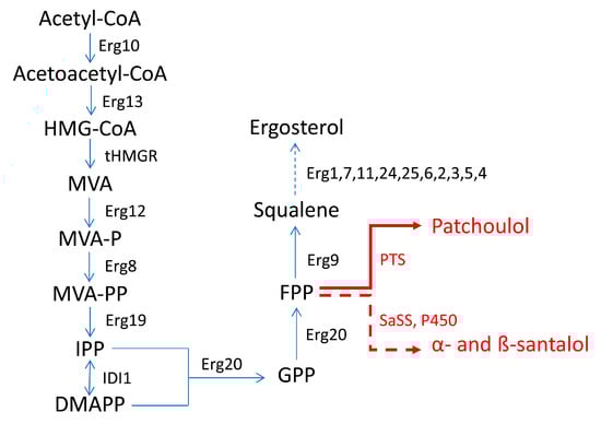 Biosynthetic pathway to produce patchoulol and α- and β-santalol in S. cerevisiae in the works of Zha et al. (2020) [47] and Ma et al. (2019) [9]. Erg10—acetyl-CoA C-acetyltransferase; Erg13—hydroxymethylglutaryl-CoA synthase; tHMGR—truncated 3-hydroxyl-3-methylglutaryl-CoA reductase; Erg12—mevalonate kinase; MVA—mevalonate; MVA-P—mevalonate phosphate; MVA-PP—mevalonate diphosphate; Erg8—phosphomevalonate kinase; Erg19—diphosphomevalonate decarboxylase; IDI1—isopentenyl diphosphate δ-isomerase; Erg20—farnesyl diphosphate synthase; Erg9—squalene synthase; SaSS—α-santalene synthase from S. album; PTS—patchoulol synthase; P450—enzymes of the cytochrome P450 family (CYPs). Dashed-line arrow indicates multiple steps.