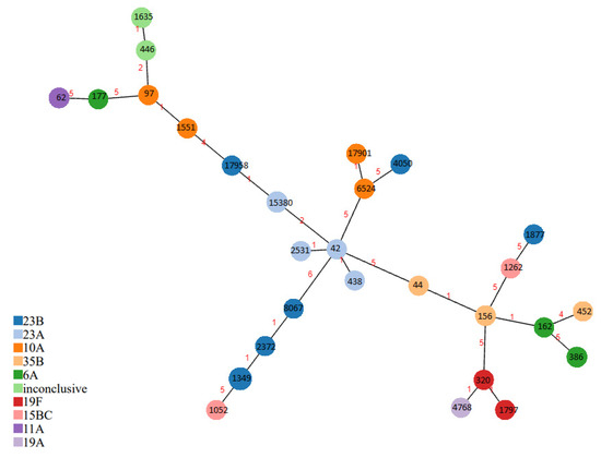 Minimum spanning tree based on allelic profiles for nasopharyngeal S. pneumoniae isolates from healthy children. Colors show the presence of different serotypes (inconclusive—serotype 35F/47F). Circles present the sequence types (STs) with their size corresponding to the number of isolates. Link labels are shown in absolute count of differences.