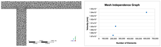 For a fluid flow solution, sufficient refinement must be achieved to ensure that the mesh does not have a negative impact on the numerical solution. A solution computed for an adequately refined mesh is considered mesh/grid independent. A less than 2% error was deemed an acceptable value for mesh independence in this study. The element size for the mesh independence was determined by modelling a single blood vessel represented by a solid cylinder of radius 0.001 m and length of 0.1 m. The mesh was generated with an initial element size of 0.0000334 m, and the blood velocity was set to 0.19 m/s at the inlets. The process was repeated twice, decreasing the element size in each subsequent run. Given that wall shear stress is calculated from velocity (and CFD computes velocity and pressure fields), velocities at the outlet of the flow field were compared, and the error (1.41%) was found to be sufficiently small for an element size of 0.0000334 m. Both the mesh and the mesh independence graph are illustrated in Figure 1.