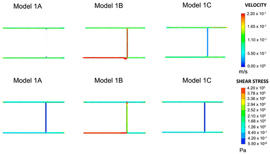 Velocity and shear stress results for Models 1A–1C. This was the same model with variations on inlets and outlets, as shown in Figure 2. Given the plausible velocity and shear stress ranges, Model 1C was chosen as the baseline model for all subsequent variations of Model 1.