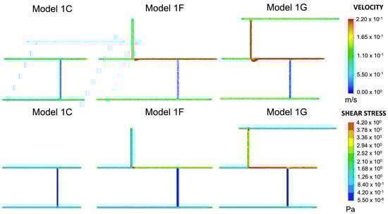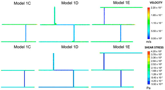 Velocity and shear stress results for Models 1C–1E. This was the same model with variations on inlets and outlets, as shown in Figure 2. Given the plausible velocity and shear stress ranges, Model 1C was chosen as the baseline model for all subsequent variations of Model 1.