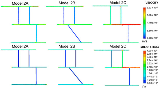 Velocity and shear stress plots for Models 2A, 2B and 2C. All three models represent the complete network.