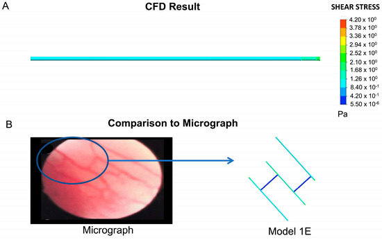 Quantitative and qualitative verification of the computational model. (A) Shear stress plot for a straight pipe based on the same parameters as those employed in Models 1 and 2. (B) Comparison between the geometry that emerged from Model 1 (Model 1E) and the original micrograph that was used to inform the initial model (permission obtained from RightsLink/Elsevier) [75].