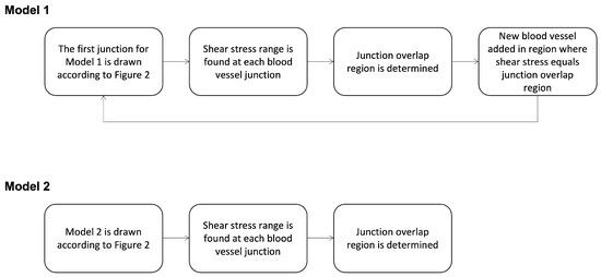 Two different approaches, shown in Figure 7, were taken to develop models of blood vessel networks. The first approach (Model 1), shown in Figure 7, progressively added vessels based on shear stress thresholds. Given the strong link between shear stress and angiogenesis, we sought to find shear stress values that might support the development of new blood vessels. The process for determining the thresholds is described in the following paragraph and the threshold values are shown in Table 1 and Table 2. The second approach (Model 2), also shown in Figure 7, modelled the complete vessel network as a starting point. Both models were used to analyse the relationship between wall shear stress and the development or positioning of new blood vessels. These examined how low shear and high shear regions influence blood vessel formation.