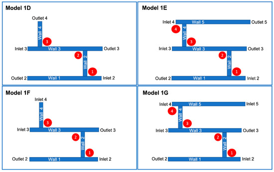 Geometries which emerge from vessels added to Model 1C. Models 1D and 1F are similar, except for inlet/outlet 4. Similarly, Models 1E and 1G differ only in so far as inlet/outlet 5 is concerned.